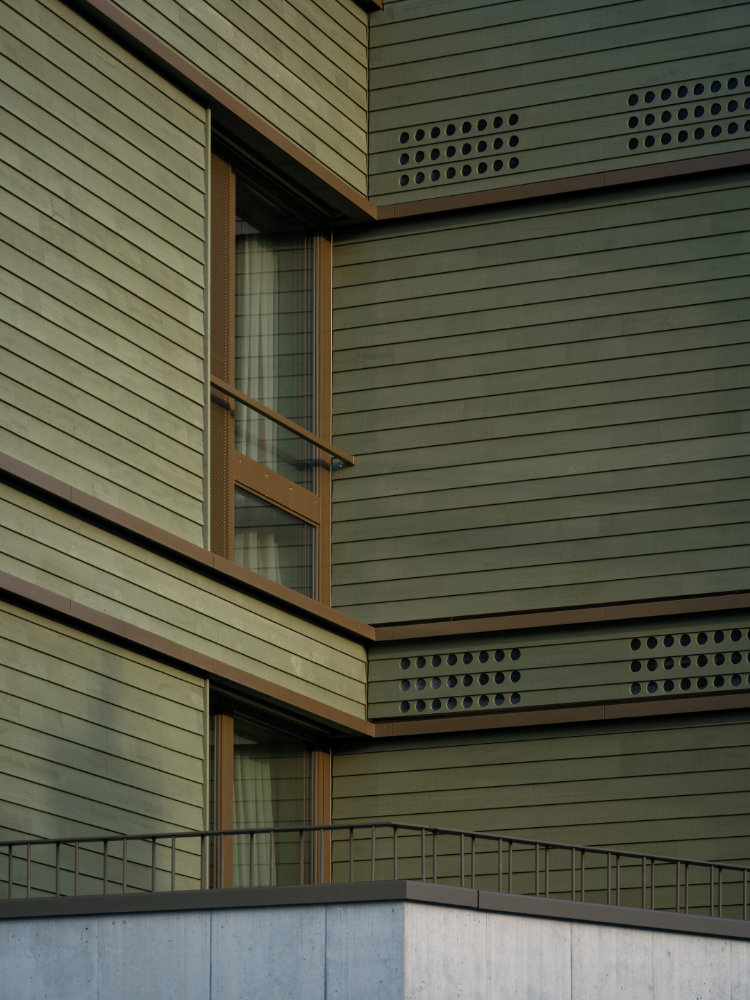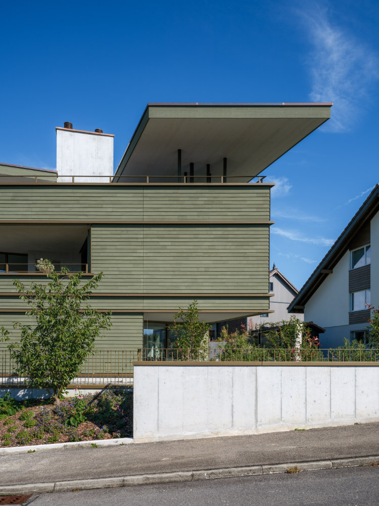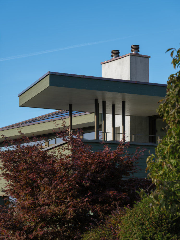 Die mittige Treppenskulptur und der zentrale Kamin gliedern die horizontal ausgerichtete Bauform und schaffen zugleich vertikale Akzente. Die Kombination aus massiver Betonkonstruktion und einer hinterlüfteten Holzfassade aus einer sägerohen Fichteschalung mit schilfgrüner Schlammfarbe verleiht dem Haus eine markante, zugleich zurückhaltende Präsenz im Gelände.