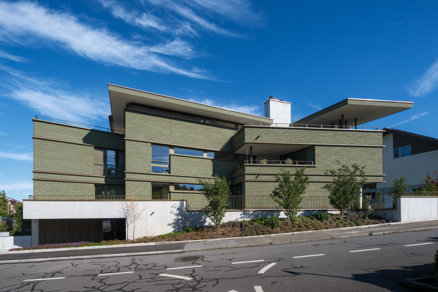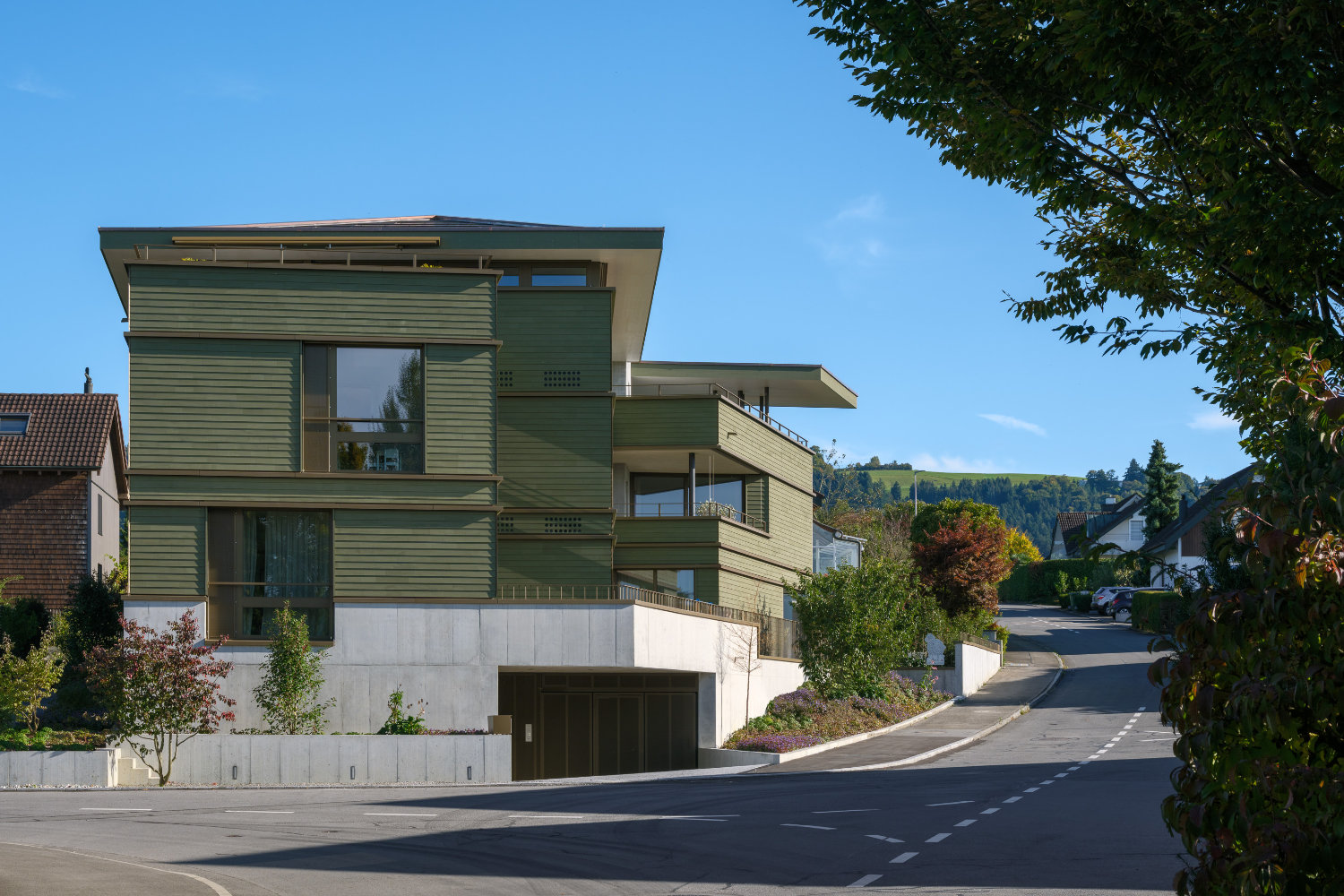 In Buchrain entstand ein gemeinsames Wohnhaus für die Familien zweier Geschwister. Der vielgliedrige Baukörper orientiert sich an der Orthogonalität der Bebauungsstruktur und öffnet sich fächerartig zur schräg verlaufenden Strasse. Die gemeinsame Erschliessung erfolgt vom Quartierplatz aus über eine geschützte Eingangshalle im Untergeschoss. Ab hier funktionieren die beiden Wohneinheiten als eigenständige, ineinander verschlungene Wohnskulpturen.