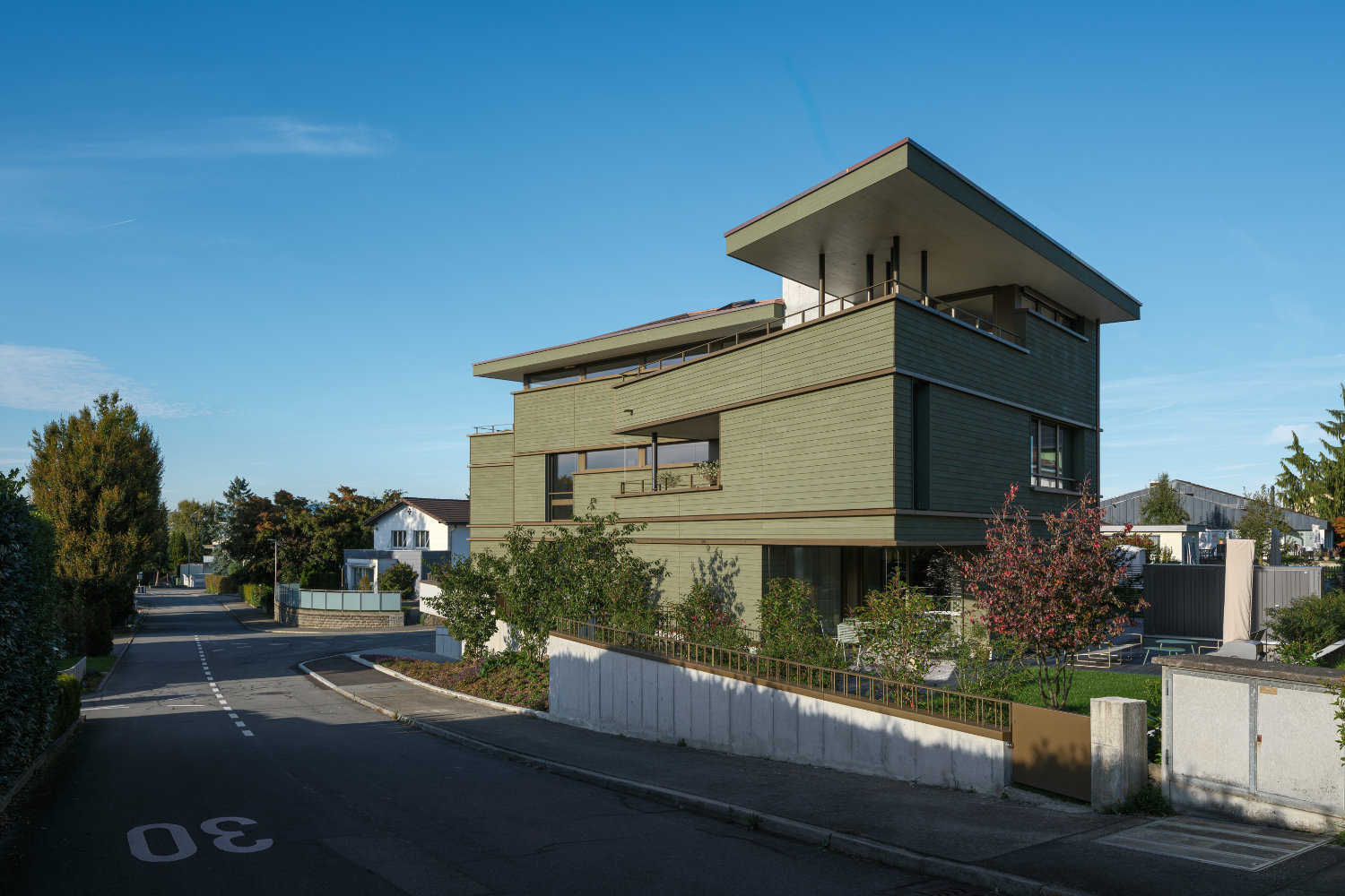 Grosszügige Vordächer schützen das Gebäude und setzen klare Abschlüsse nach oben. Die Fenster vermitteln zwischen Innen und Aussen und bilden zusammen mit den horizontalen Fassadenelementen eine spannende Komposition, die sowohl Privatsphäre als auch Ausblicke ermöglicht. Das leicht abfallende Gelände wird sanft modelliert und integriert Aussennutzungen wie Plattformen und Pools in die Topografie. Die Umgebung ist mit einheimischen Pflanzen naturnah gestaltet und verbindet das neue Haus harmonisch mit dem durchgrünten Wohnquartier.